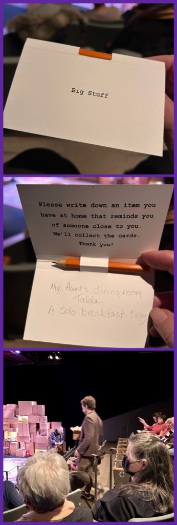 as we entered the theatre we were given a card with a pencil in it… most people did respond and the actors collected all of them and dumped them into a couple of boxes…