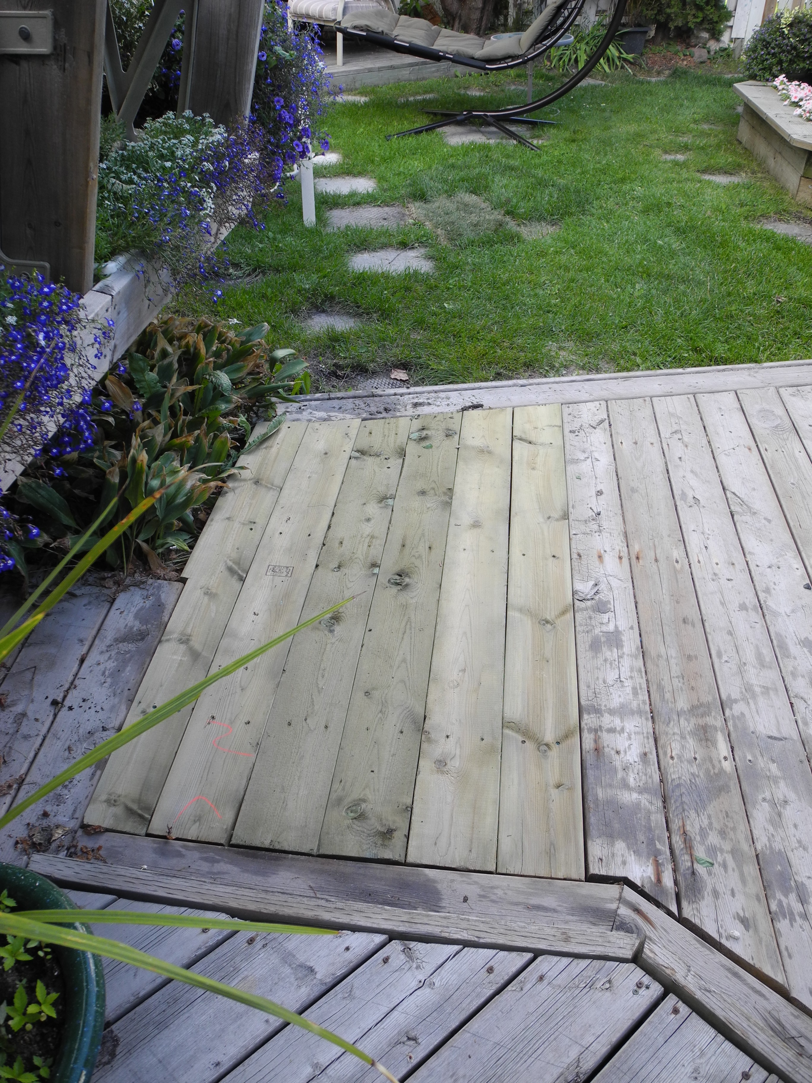 after Dan finished the door he fixed six deck boards which had oil spilled on them and they looked really awful… we’ve tried scrubbing with soap and water, putting on grease remover and nothing made a difference so I just decided to replace them and be done with it… looks great now…