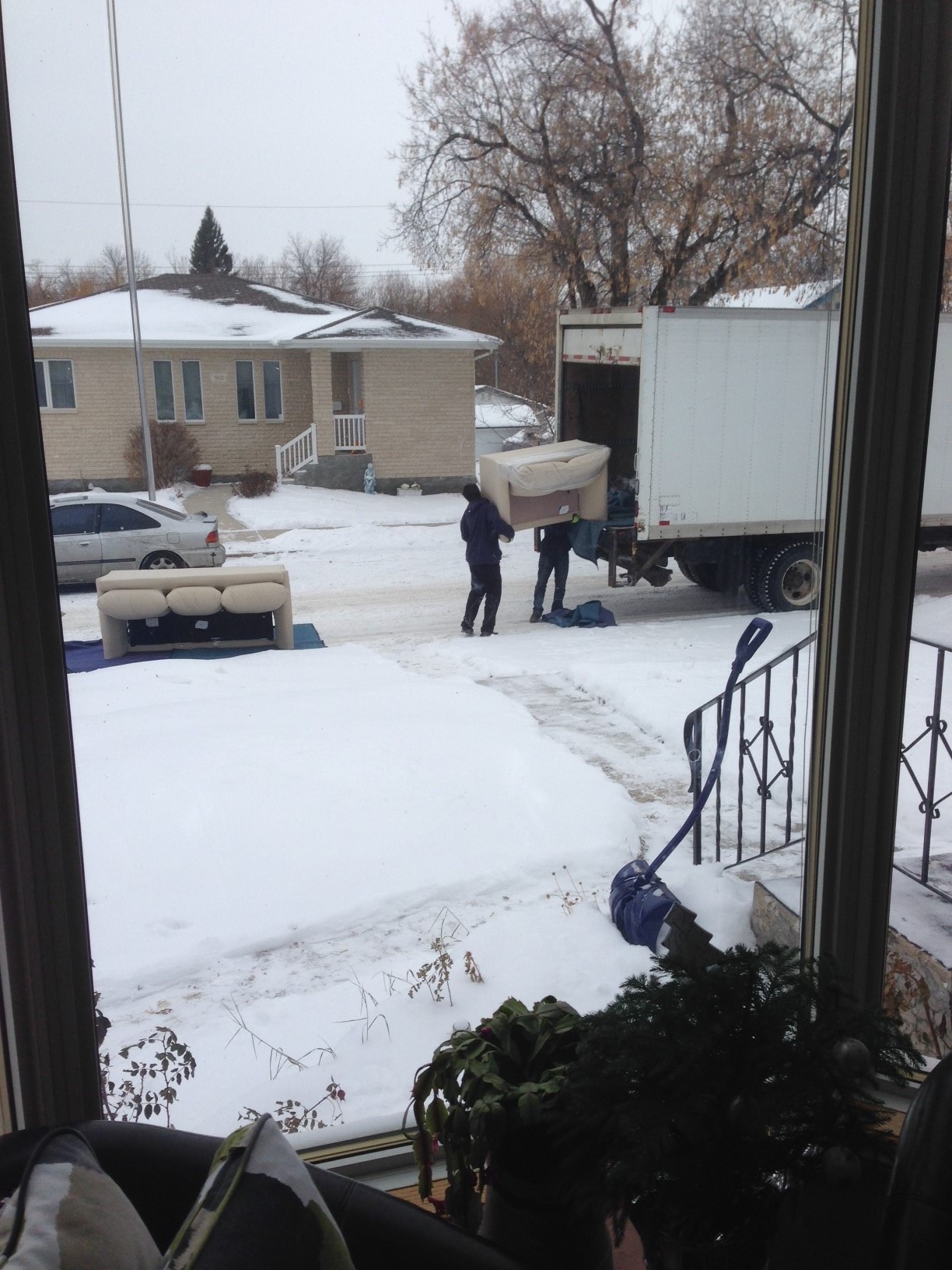 they got out the ripped hide-a-bed without too much trouble… brought in the love seat and then discovered that they couldn’t take off one of the legs on the hide-a-bed as a nut was stripped… there was no way it would fit through the doorway with a leg still on it… so, they took it back… they also took my old sofa and love seat…