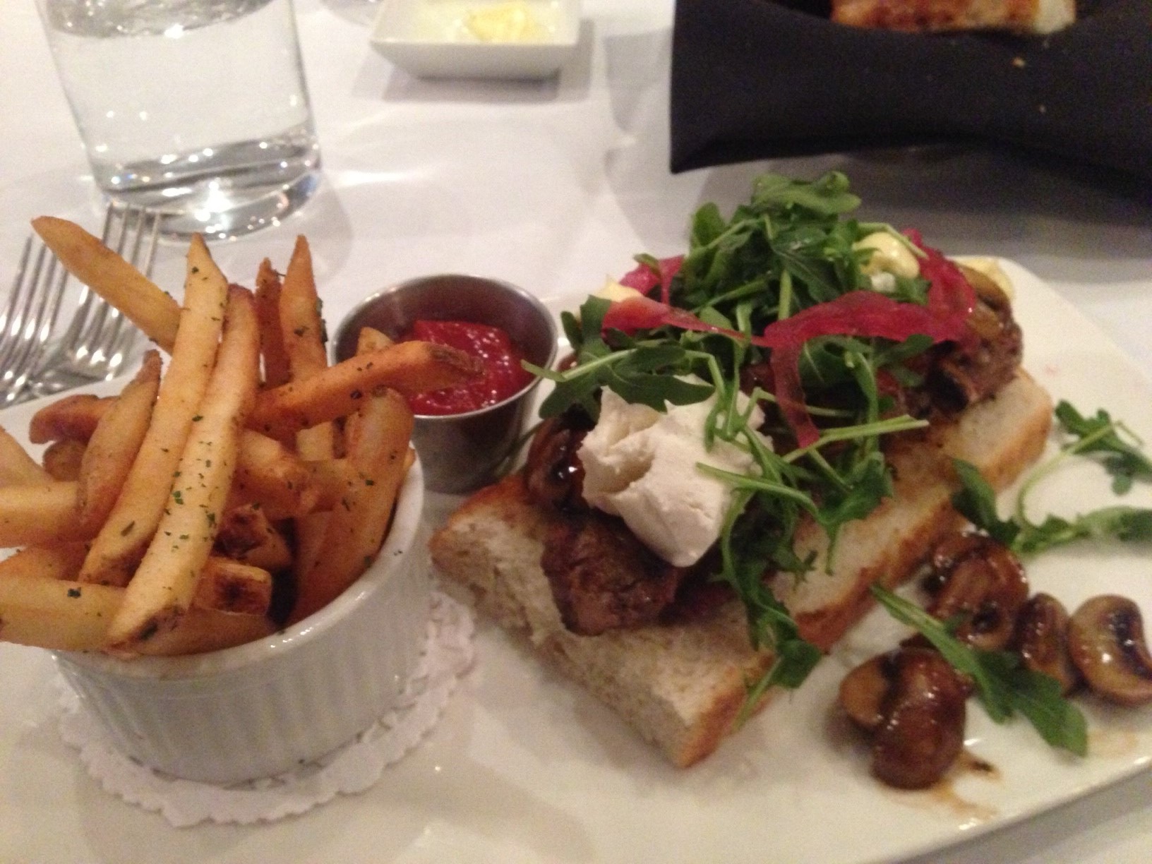 the steak sandwich was very nice although I don’t remember tasting the truffle aioli, lol… the French fries were okay… the service was good and the space is quite modern, which I like…