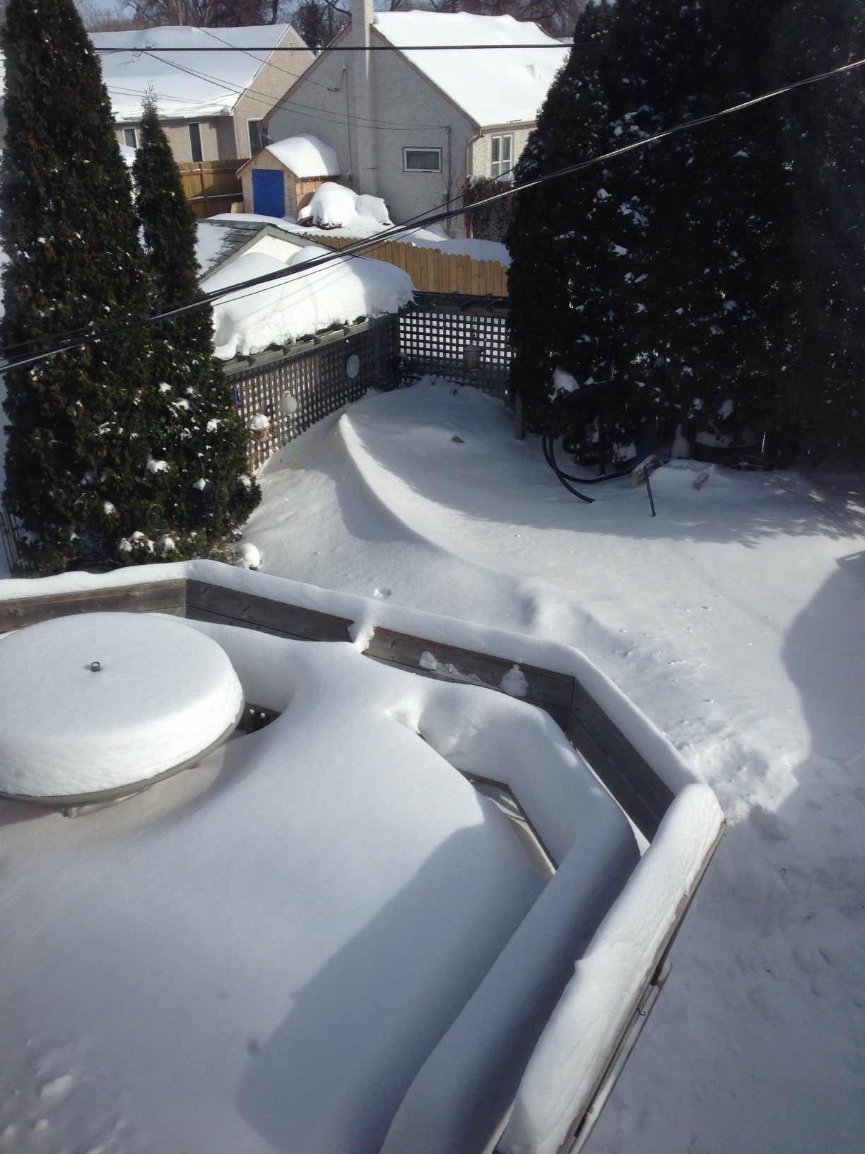 the sun shone all day… always perks me up… took a picture of the snow in the back yard which has almost completely covered the waterfall slab… haven’t had this much snow for many years…