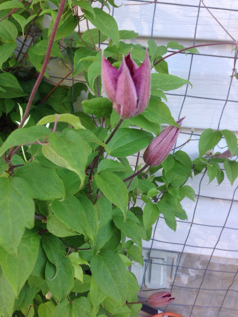 as I was heading out to work this morning, the clematis had buds opening, so I had to stop the car, climb out in a very awkward spot, reach into the back of the car to get my camera and then got this shot…
