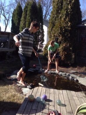 was so happy to get this done… bought the first ten bags of mulch last summer… ran over and got more as we worked… slurpees for the boys on our way home from Home Depot, a short rest and they then spent a couple of hours working on the pond…  they had lots of fun…