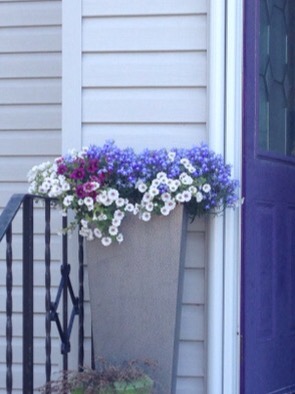 as the weather is supposed to be back to normal here, I moved a basket of flowers outside this morning, to one of the planters at the front… looked beautiful…