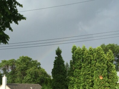 hard to see but there is a rainbow in this picture… this is what it looked like after I ran out in the pouring rain and put away all the cushions… first time they have been soaked, sigh… should have put them away before supper…