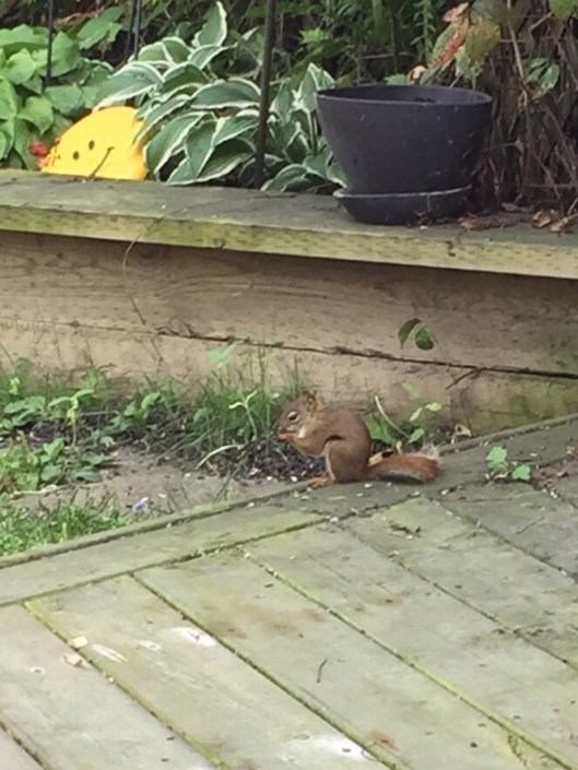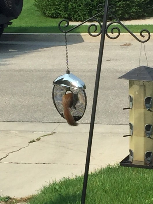 later in the day either the same squirrel, or a relative, had a great time at the garden feeder while I was reading…