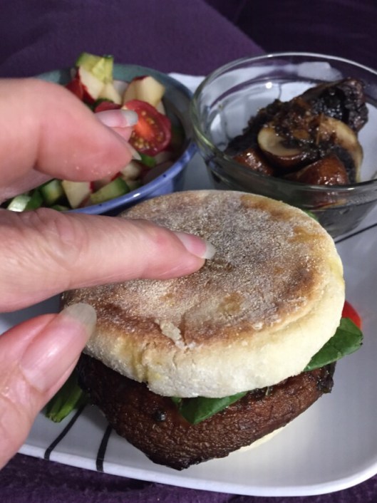 used a Pinterest recipe where the mushrooms were marinated for thirty minutes in oil, balsamic, garlic, basil and cilantro… baked them for twenty minutes at 400 degrees…