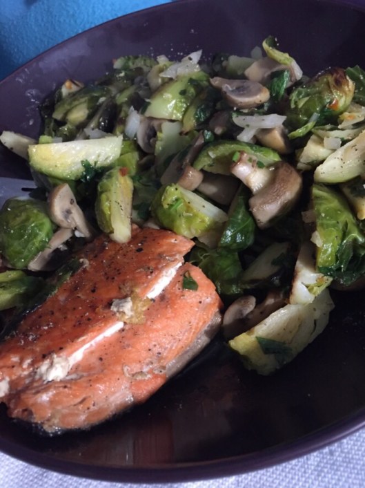 as it happened, I had a piece of salmon in the fridge that I’d taken out for my supper, and all the other items as well… I didn’t have sweet potato, but had a leftover baked potato so I substituted that…