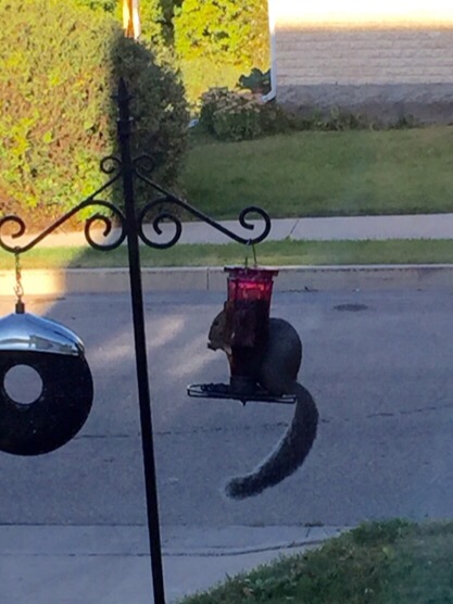 this morning I discovered a squirrel on the feeder in the front yard… I was surprised because I didn’t think they could get to it…