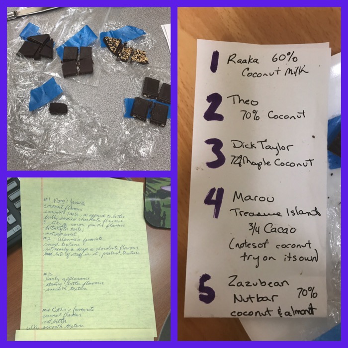 at lunchtime three of us did a little chocolate tasting… we had a great time… comparing how the small pieces taste for each of us is way more fun in a group than individually…