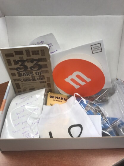 two tasting packages, a cute notebook, a card and a hummingbird chocolate bar in a tiny love bag…