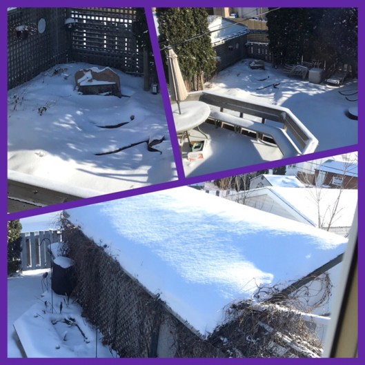 early in the day I took a few photos of the beauty in the backyard… the sun shone on the snow and the critters hadn’t made any paths through the white… even the garage roof was pristine…
