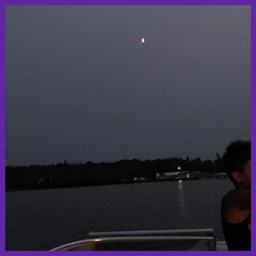 got ready for supper and my daughter arrived from the city… hot dogs and smokies on the fire, clean up and off for an evening ride on the boat…