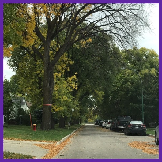 many branches on the trees are bare… and the street is covered with leaves… when I took the picture I was focusing on the leaves on the street… only discovered the bare branches when I was preparing the picture… yikes…