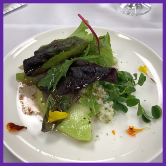 started with a salad of compressed melon, whipped goat cheese and apple compote, mint, red wine vinaigrette, dill salt, local pea shoots… it was yummy…