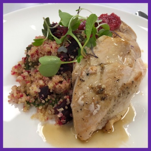 and then we had a wonderful chicken breast that was so moist… lemon brined chicken, rhubarb and brown butter sauce, crispy quinoa, beets, Swiss chard…