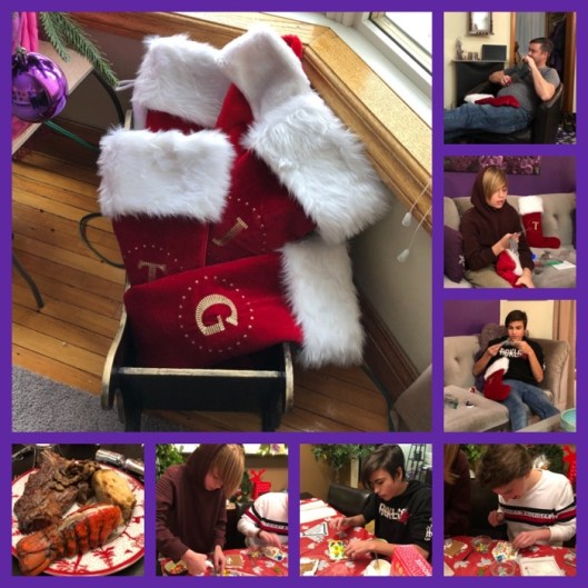 we had presents, decorated gingerbread house pieces, opened Christmas crackers, enjoyed a delicious steak and lobster dinner with stuffing muffins, twice-stuffed potatoes, mushrooms, and salad… finished up with gingerbread pieces that had a lot of icing and candies on them, lol…