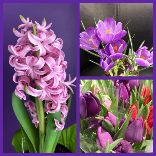 the crocus and hyacinth are doing very well and enjoying the light in the living room… also some tulips at the grocery store…