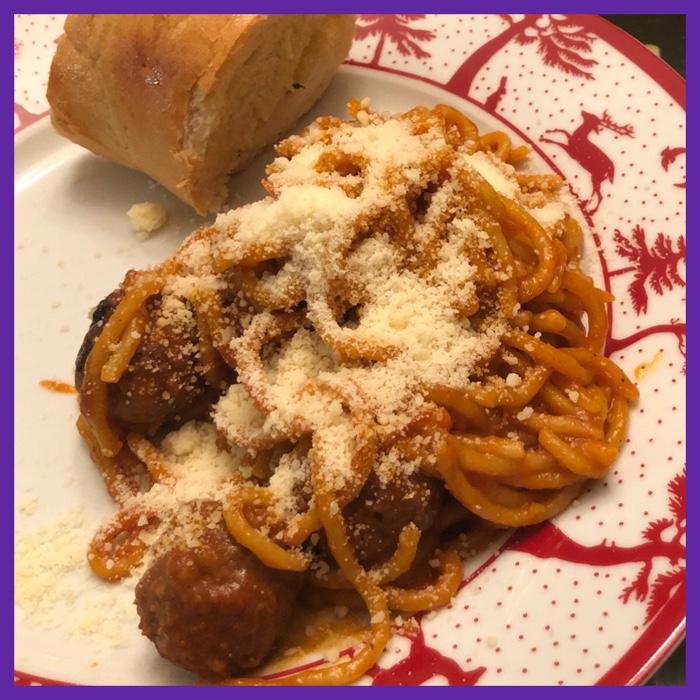 we had fresh spaghetti (which we picked up last week) and meatballs with a tomato sauce I made last week…