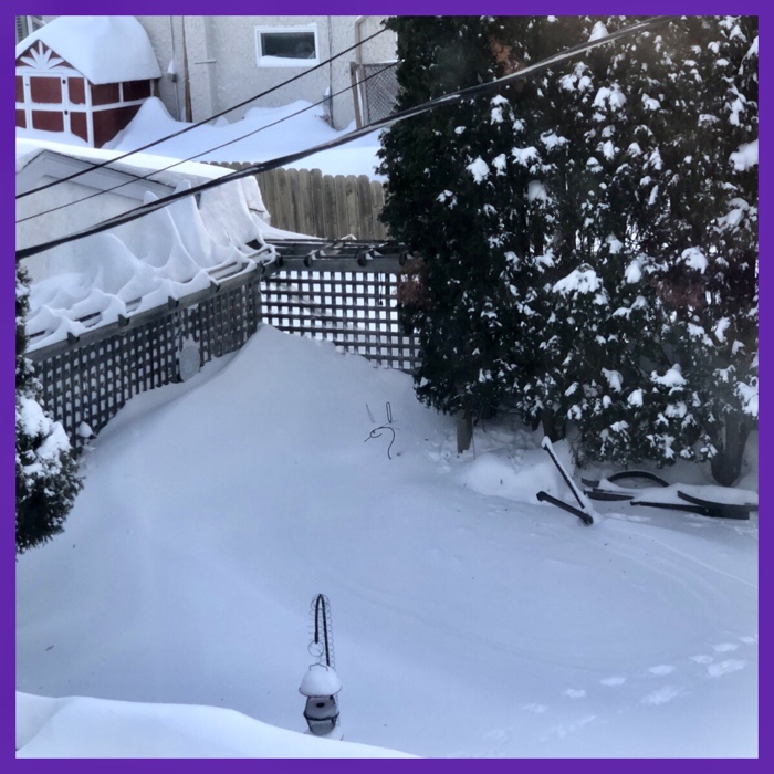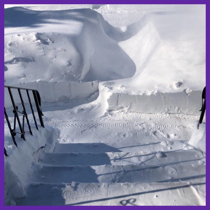 in this photo from yesterday, you can see how high the snow is on the railing… and the lovely drifts along the sidewalk…