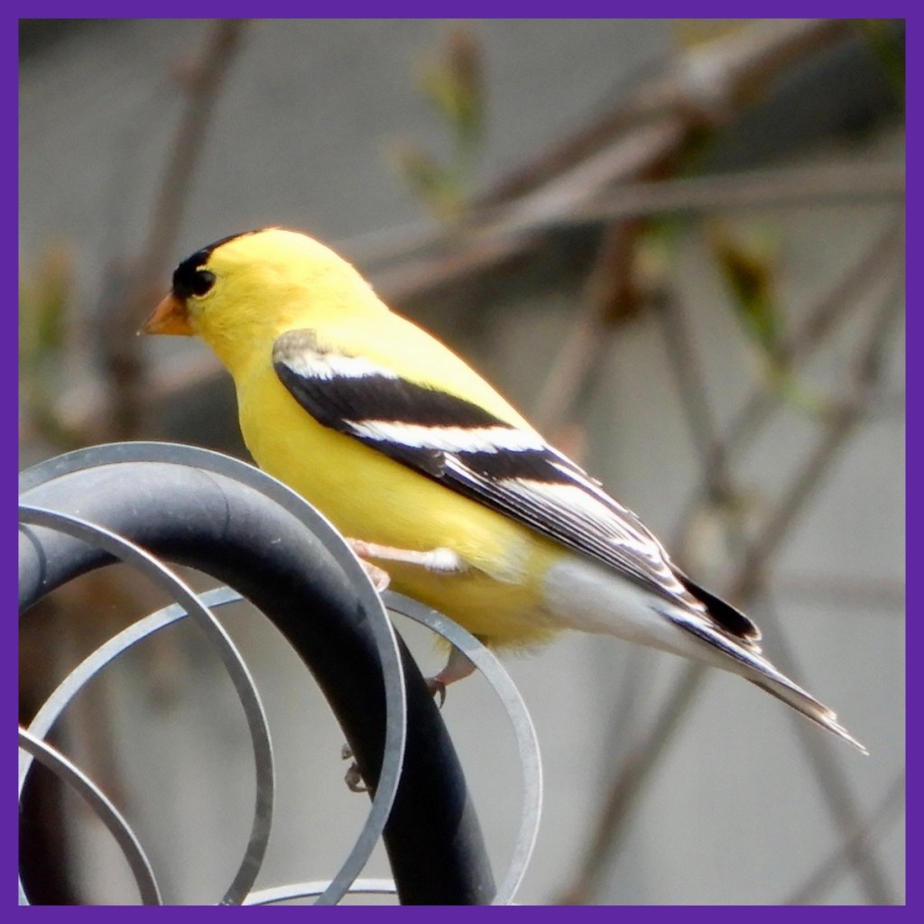 later in the day I stood up from a chair on the upper deck and spotted a goldfinch at the feeder… it flitted about nervously for a few moments and then, when it felt safe, called its partner to come and eat… they were happy for a while, until a squirrel came and chased them away…