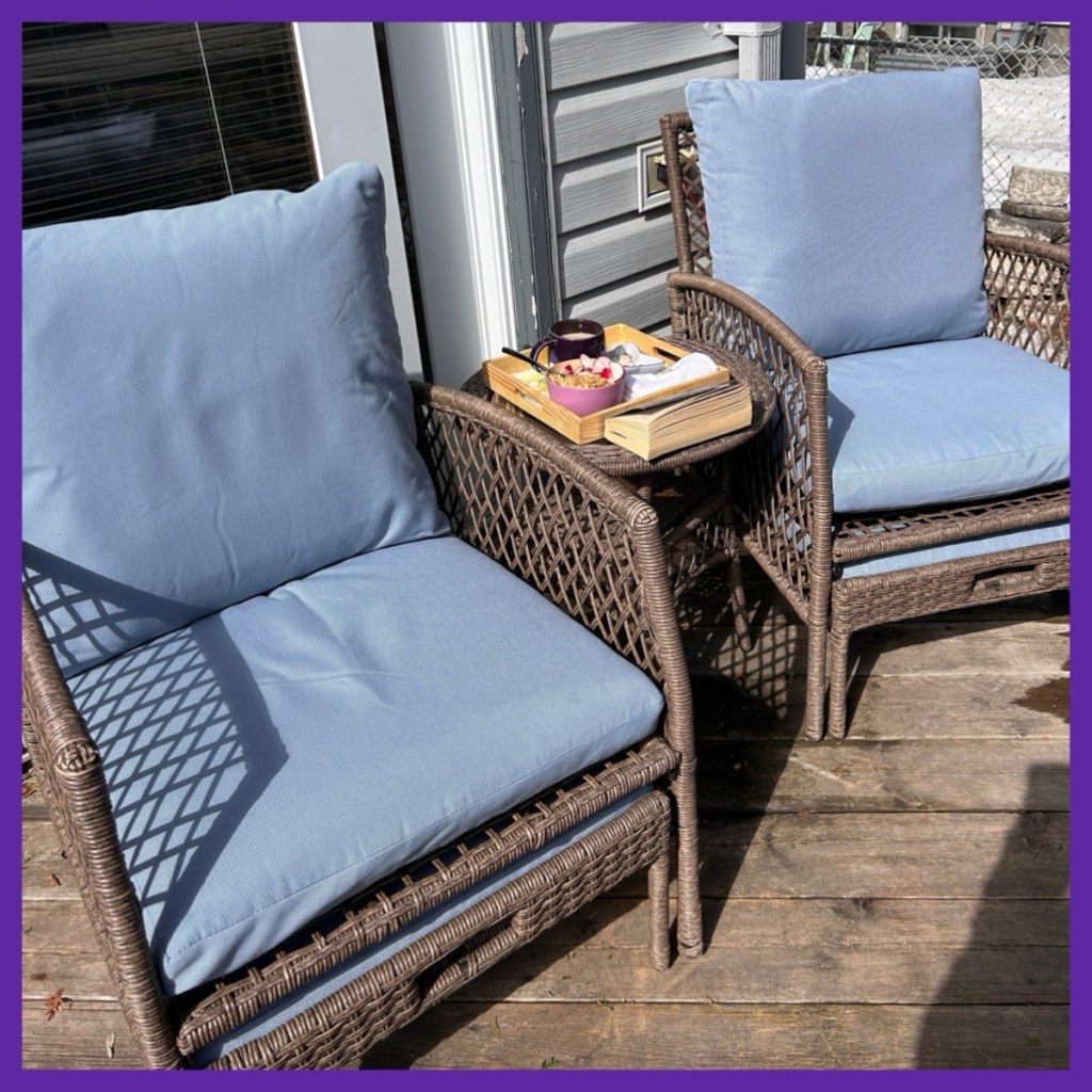 big girl pants, blessed, broom, chairs, cleaned, cushions, deck, garden, moments, nature, sunshine, Technology, warm, weather, widow
