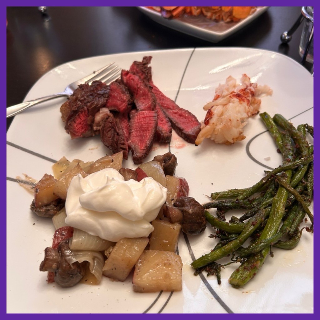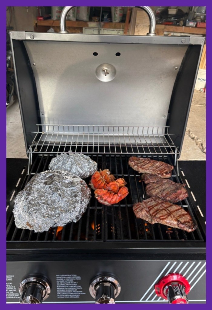 we had steak and lobster, with potatoes, mushrooms, and onions in foil… all done on Glowy…