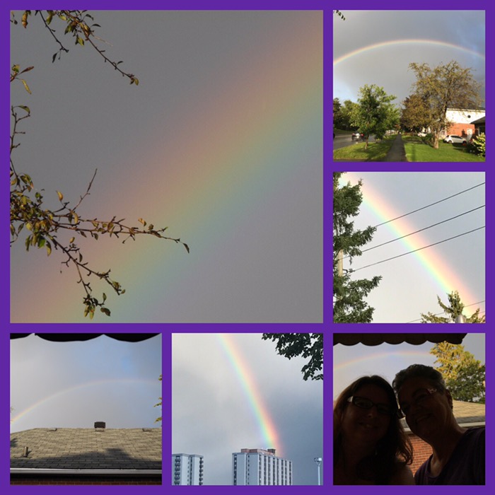 it rained off and on all afternoon and we saw two different double rainbows… one as we were driving home and the second as we were looking out at the dark clouds on the street…