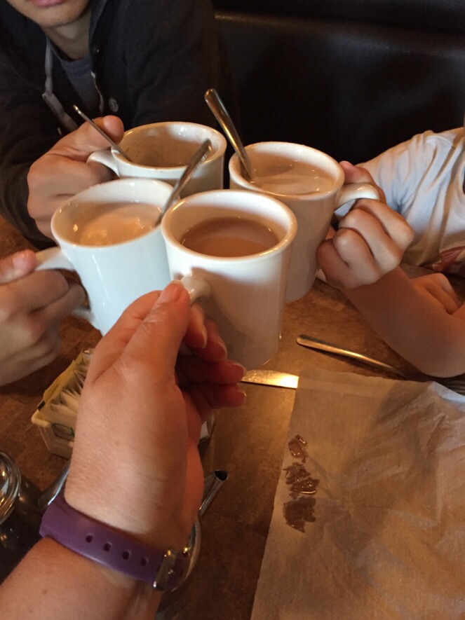 once his ashes were scattered in the creek, everyone dropped a daisy or two into the stream to travel with him… then we walked over to the “A” for breakfast, which used to be one of our weekend activities, particularly over the last three or four years… nearly everyone had the special – George’s favourite – and we had a great visit with one another…