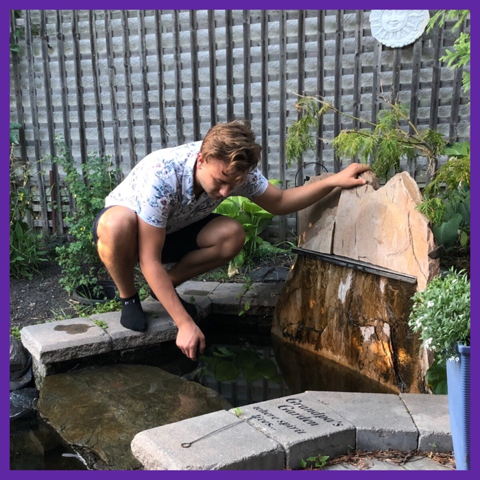 after supper we sat in the garden and my grandson decided he should catch the goldfish that we had popped into the top of the pond hoping they would grow a bit before joining the other fish as they were very small… they have grown quite nicely so we thought they could move to the other section of the pond…