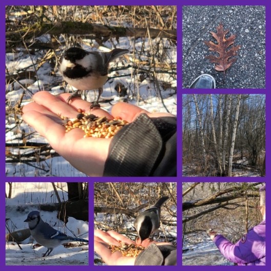 in the morning my daughter and I headed to Bulk Barn for bird seed and then on to Mer Bleue where it was way too slippery for a walk but we spent a lovely time feeding the birds from our hands… such fun;-)…