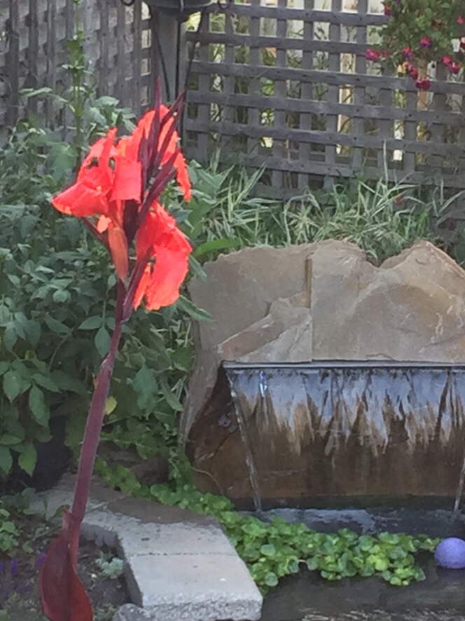 looking toward the pond from the deck, got a nice pic of the canna with the waterfall in the background… happy that it is going through another set of blooms…