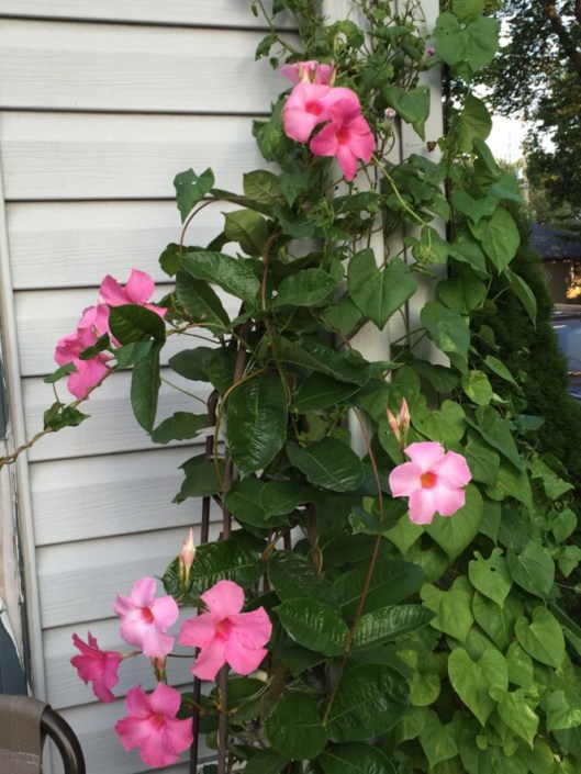 the mandevilla is filled with blossoms and flowers…