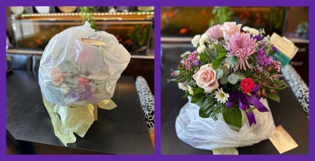 when I removed the packaging, I found a beautiful purple vase filled with flowers… what a treat…