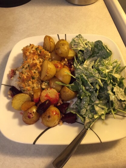 brought it in, unpacked it and made Hazelnut Crusted Cod with mini potatoes, beets and kale salad for my supper…