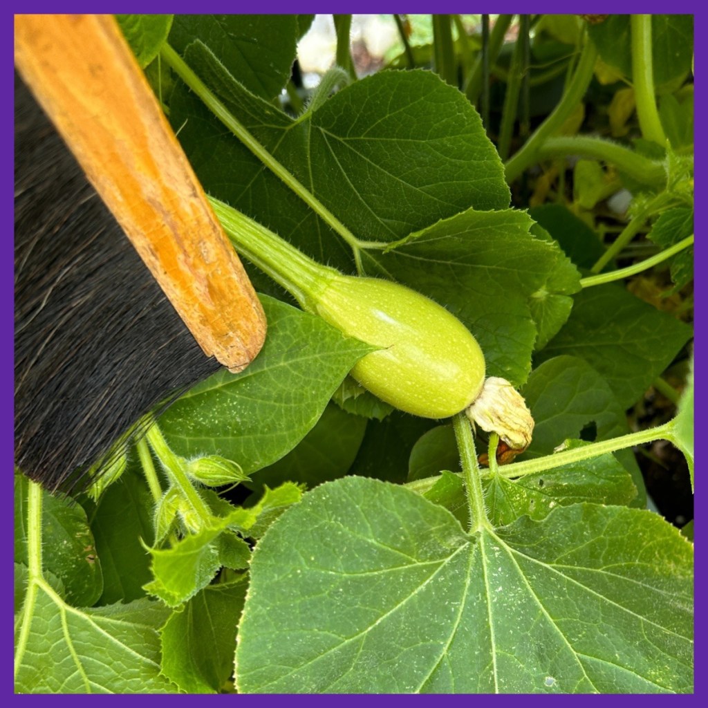 one batch of cucumbers haven’t put out even the start of a cucumber, so I have been brushing them with a drafting brush that was my beloved’s in the hope that some might get pollinated and produce fruit…