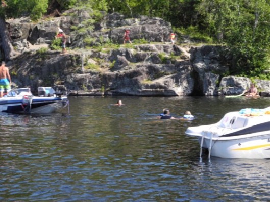 four boats and a seadoo crossed the lake together to the Death Swing, where my daughter cut her heel on the propeller, bled a bit and it will be irritable for a while whenever she bends her ankle, but she’s okay…
