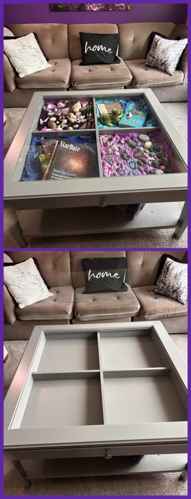 they have been filled with items from paper clips, a label maker, seeds, purple and handmade items, as well as a favourite chocolate bar ;-)…