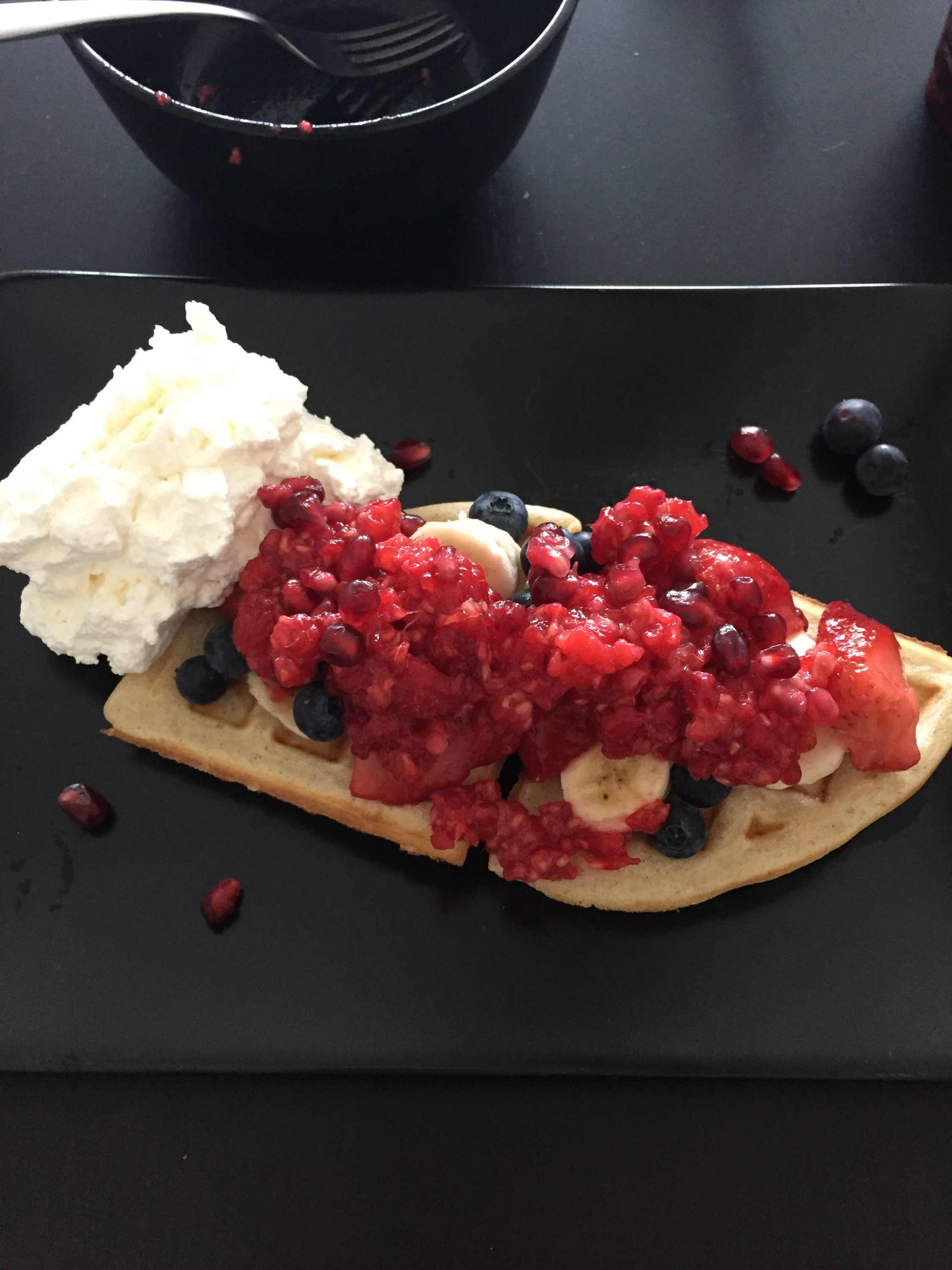 we sat down to freshly made waffles and covered them with fresh fruit and a bit of whipping cream…