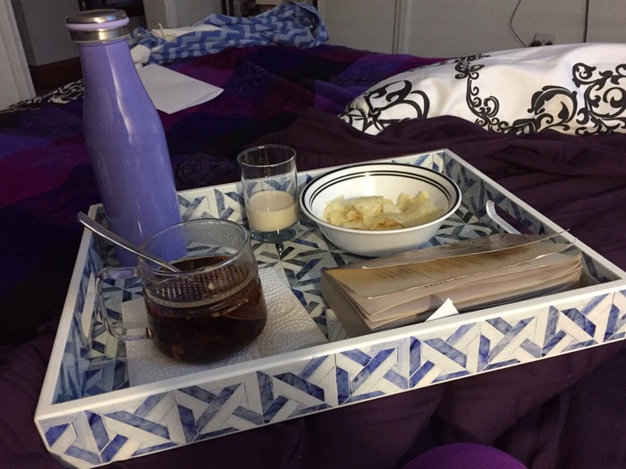 colouring (in adult colouring books, because he is way beyond kid books), electronic games, tv, hot tubbing and chocolate milkshakes before bed…