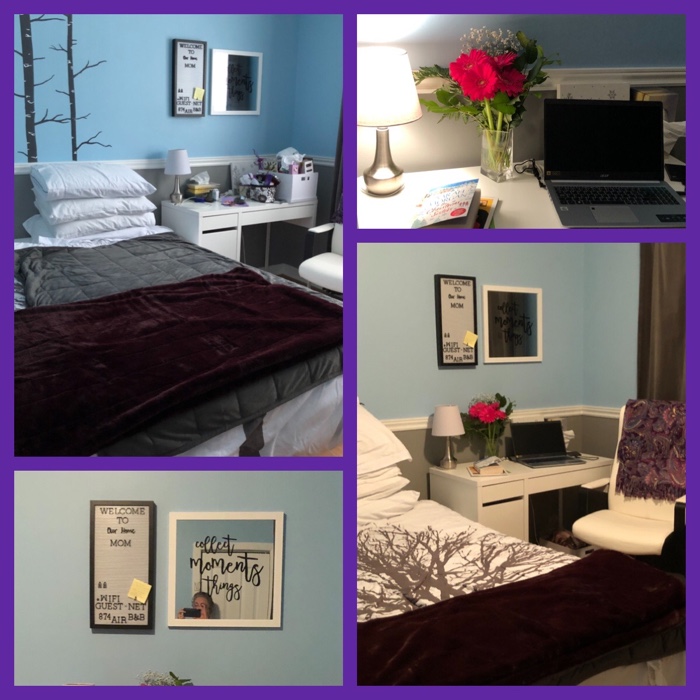 Airbnb, big girl pants, comfortable, computer, digs, flowers, memories, moments, purple, widow
