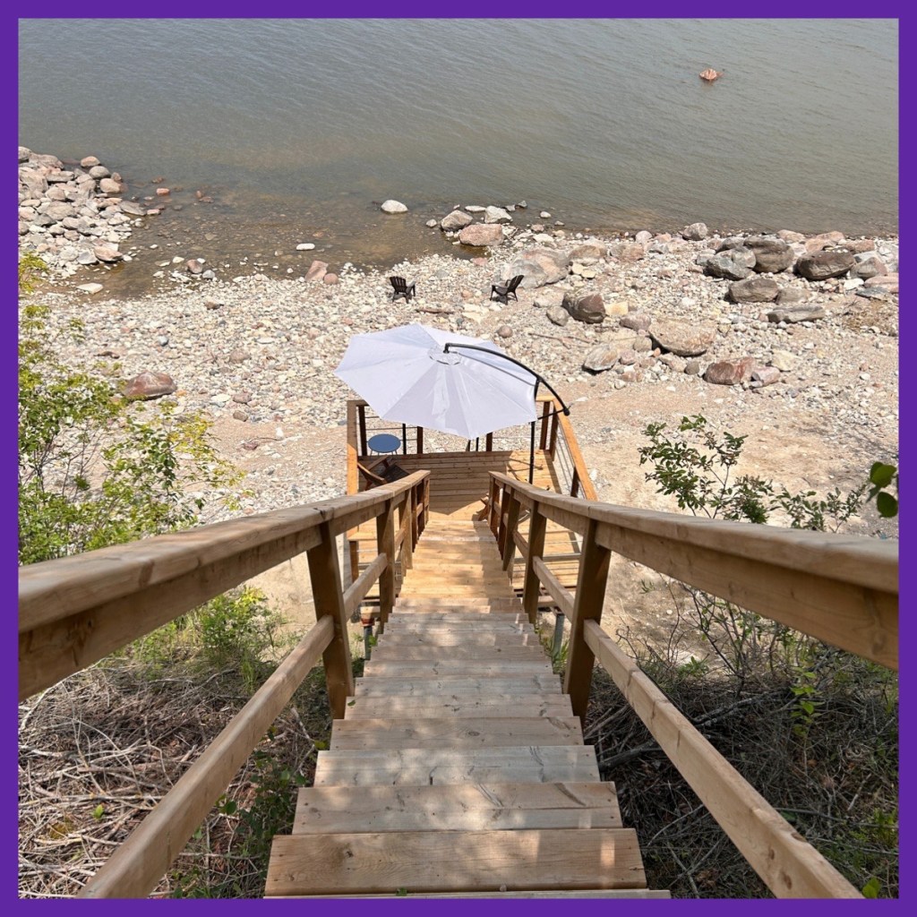 then there is a deck which leads down to a grassy area, and a deck on the edge of the cliff, as well as one on the shore…
