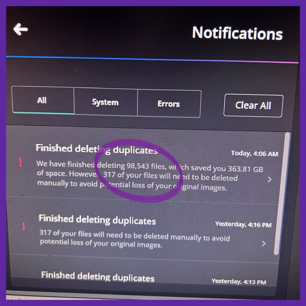 one of the things it does is combine all your photos and remove duplicates… still working on that one, lol…