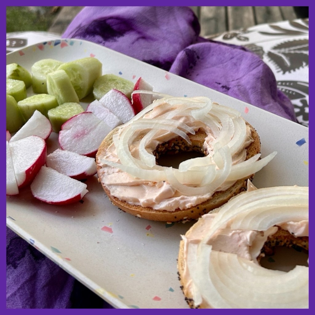 today, for lunch, I had a toasted everything bagel with salmon cream cheese, onion, and fresh radishes and cucumbers…