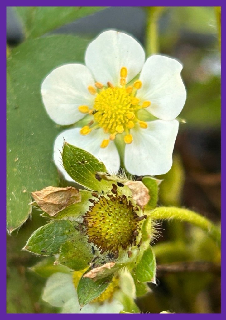 the hibiscus is still in the shade since coming outside recently and the begonias and verbena are happy… sadly the pansies in between them are not doing well…the strawberry pot and dahlia next to the back door look excellent as do the morning glories as they come up…