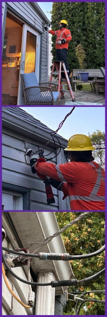 who knew that I’d be writing about electricity instead… as I was making my supper I heard a loud noise on the deck… looked out to see the electrical wires had pulled away from the house… were still attached, but hanging at least a foot lower than before…