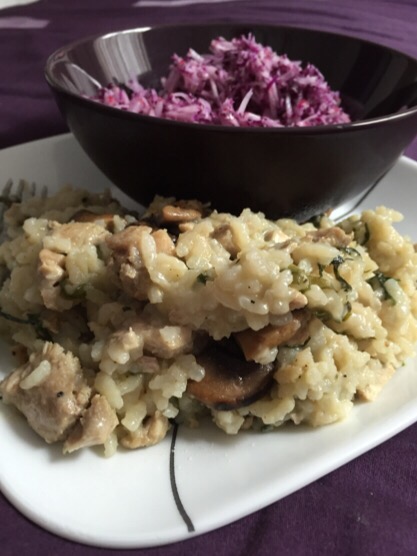 after a bit of time in their backyard, was dropped at home where I had lunch and a nap… for my dinner I warmed up some risotto that a friend had brought to me a few days ago and made some coleslaw to go with it…