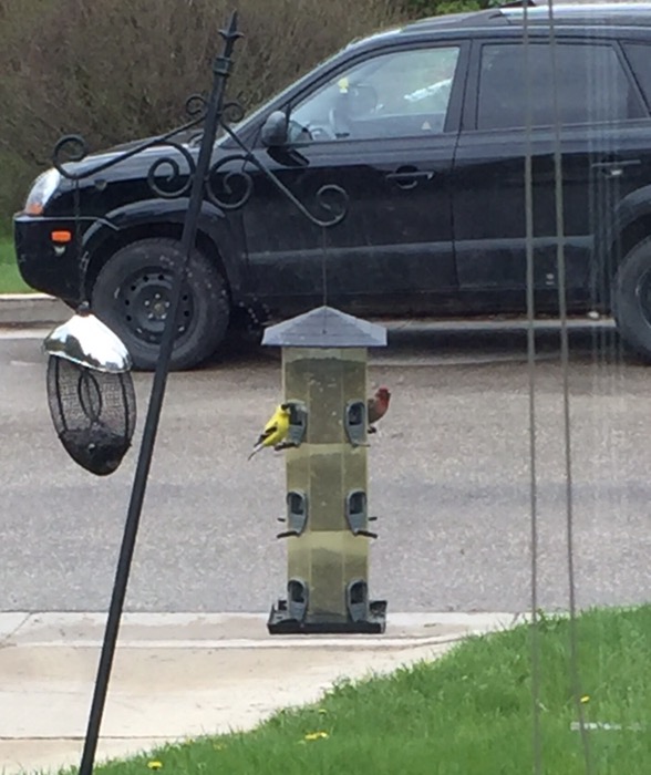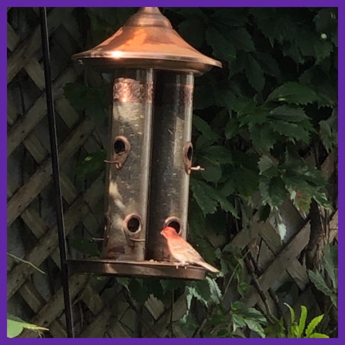 out in the garden I spotted a house finch couple enjoying snacks at one of the feeders…