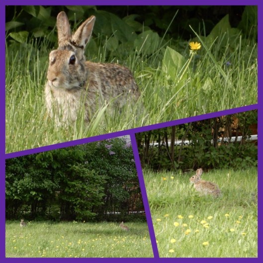 as I was walking down the next street, two bunnies froze in place as I was coming down the sidewalk… the yard they were in was filled with dandelions which they love…