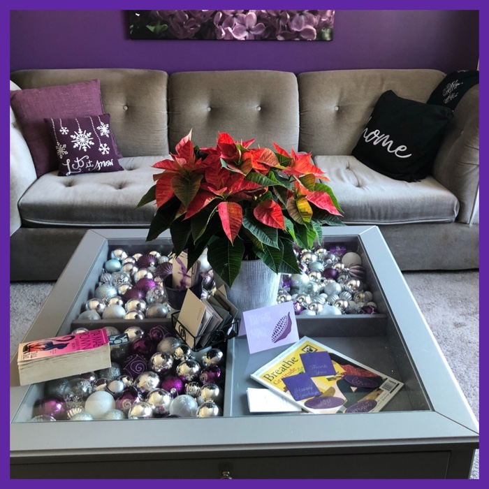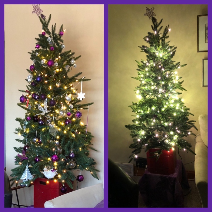 found purple, silver and clear ornaments and listened to Christmas carols as I added them to the tree…